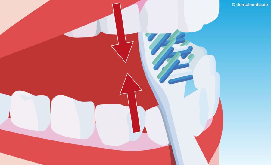 Als letztes werden die Innenflächen mit kleinen Kreisen oder Drehbewegungen „von Rot nach Weiß“, das heißt vom Zahnfleisch zum Zahn gereinigt.